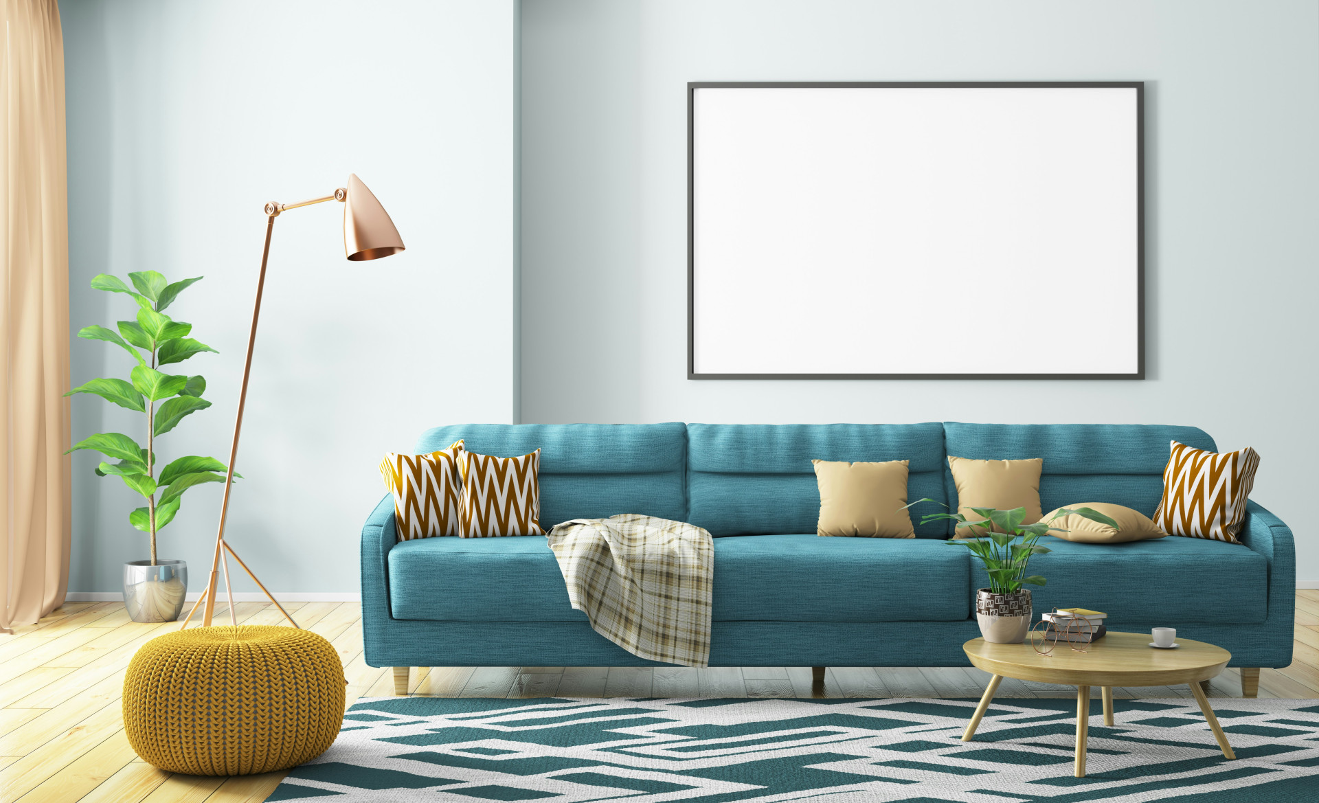 - Et tæppe under sofaen samler rummet og skaber en visuel base.